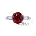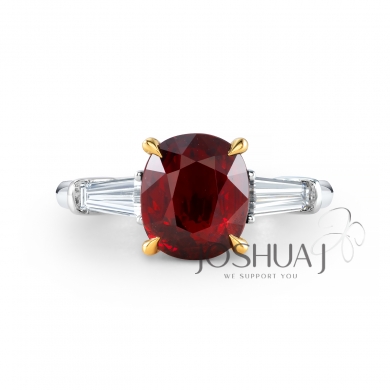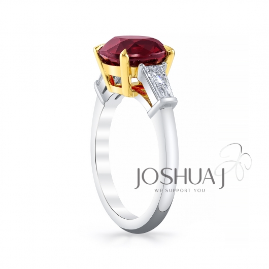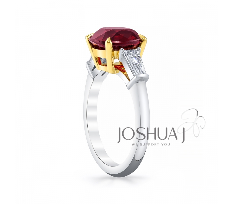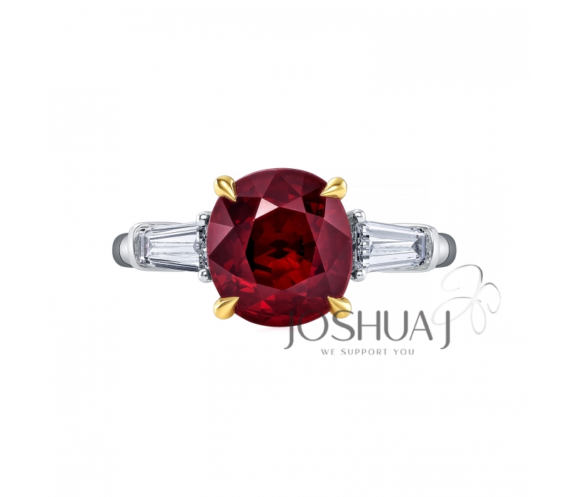 This sophisticated three-stone ring centers on a magnificent GIA-certified 4.09 carat cushion-cut ruby from Mozambique, its vibrant hue a testament to nature's artistry. Flanking this exceptional gem are two perfectly matched tapered baguette diamonds, totaling 0.60 carats, boasting remarkable D color and VVS clarity. The elegant design is masterfully set in a striking combination of platinum and 18K yellow gold, creating a piece that exudes timeless luxury and refined taste.