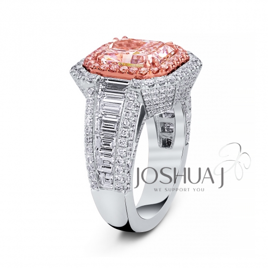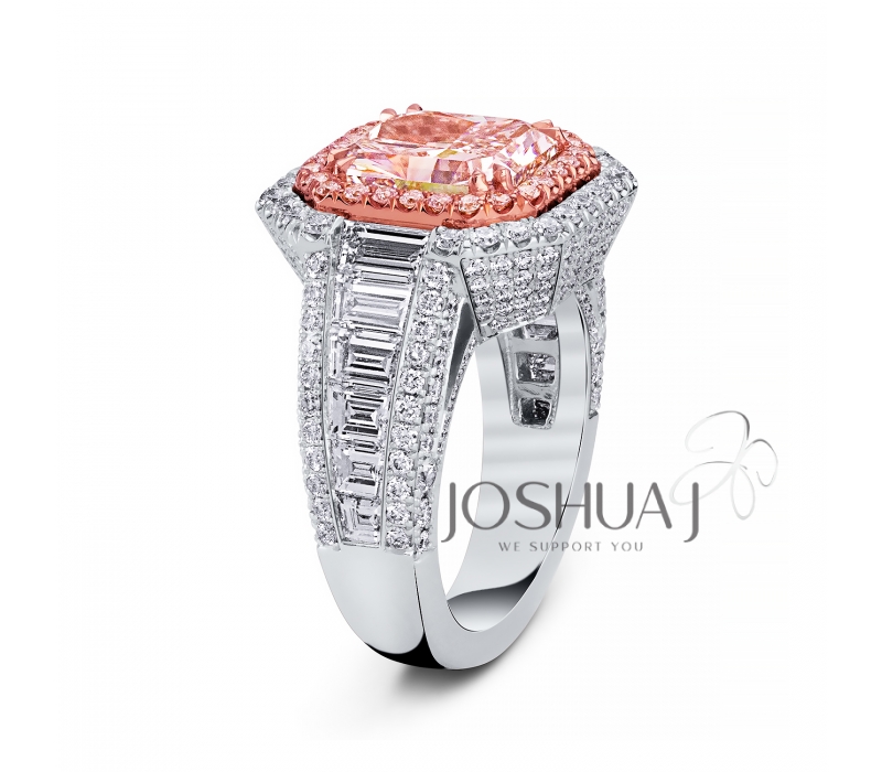 Make her reality better than dreams with this fancy light purplish pink radiant diamond ring. At its heart lies a stunning 3.45ct GIA radiant-cut diamond, surrounded by a double halo—an inner halo of delicate 0.23ct pink U-pavé diamonds and an outer halo of 1.46ct radiant white U-pavé diamonds. Graduating 1.41ct trapezoid-cut diamonds, channel-set with a U-pavé border, add a touch of elegance, all set in platinum and 18k rose gold. This ring is a masterpiece of rare beauty and exceptional craftsmanship.