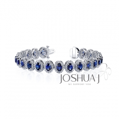 You could never go wrong in the brilliance and unfettered grace of blue sapphires. Featuring 23 oval cut sapphires at 14.84 wrapped in halo of white diamonds that consists of 368 rounds at 2.34ct. This 18k white gold bracelet has a 17.19ct total weight