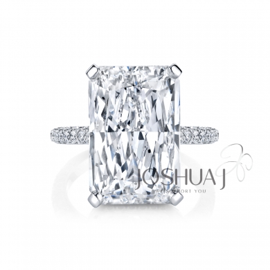Boastful at its beauty, this colossal 5.06ct K SI1, GIA Certified Radiant cut sits atop 128 colorless diamonds at 1.00ct set pave in a platinum mounting. The total weight is 6.06ct.