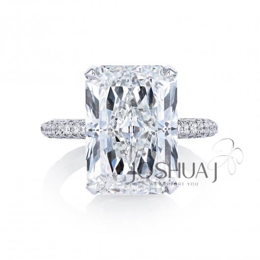 Boastful in its beauty, this colossal 9.16ct H SI1, GIA Certified Radiant cut sits atop 182 colorless Round diamonds at 1.02ct set pave in a platinum mounting. The total weight is 10.18cttw.