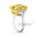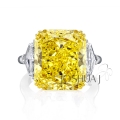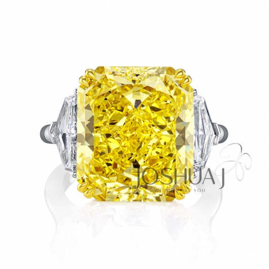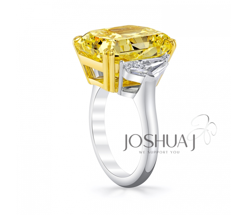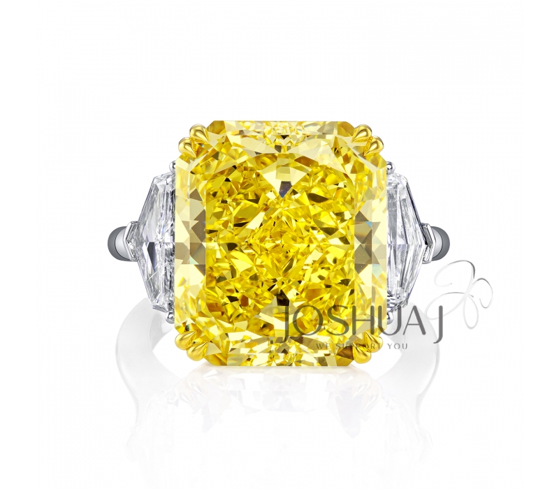 Tasteful, stately, and classic, this 15.03ct FIY VVS2 GIA radiant-cut diamond will enthrall everyone for generations to come. Two cadillac-cut diamonds of 0.96ct complete this three-stone contemporary-looking ring. Set in platinum and 18k yellow gold, the total weight for this gorgeous piece is 15.99ct.
